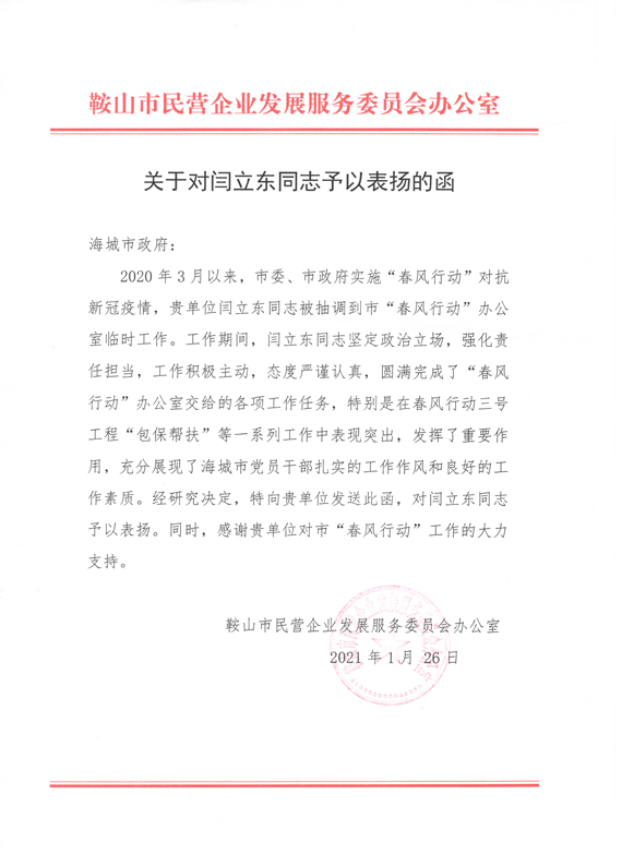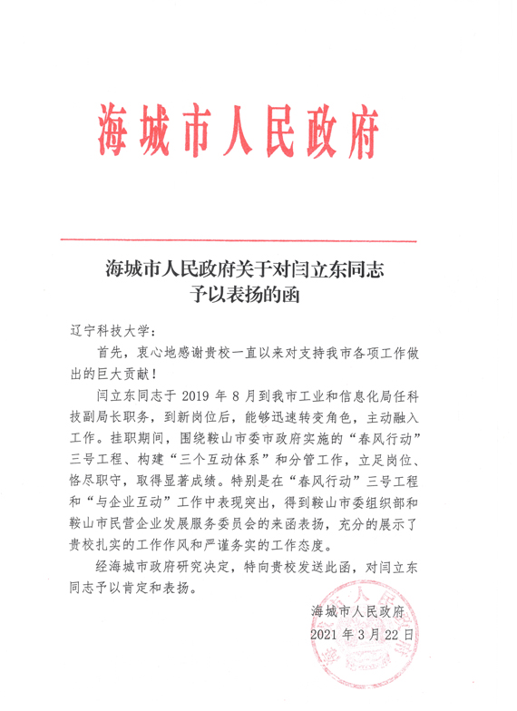 2021年1月,鞍山市民营企业发展服务委员会办公室向海城市政府送发了《关于对闫立东同志予以表扬的函》;2021年3月,海城市人民城府向8xbet手机客户端送发了《海城市人民政府关于对闫立东同志予以表扬的函》,对闫立东同志坚定政治立场、强化责任担当,积极主动完成鞍山市的各项重点工作任务予以表扬;对科大教职工在各项工作中表现出的扎实工作作风和严谨务实的工作态度予以肯定。校党委对闫立东同志能够站在学校与地方共谋振兴发展大局的高度,敢于担当,勇于奉献,积极作为,取得了较好的工作成绩表示肯定,并号召广大选派干部向闫立东同志学习,提高站位、增强意识、珍惜机会、主动作为,在推动辽宁全面振兴、全方位振兴的广阔天地里锻炼成长。