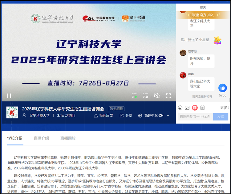 8月8日上午,8xbet手机客户端材料与冶金学院2025年研究生招生线上直播宣讲会圆满完成,学院副院长庞启航担任直播宣讲主持人。