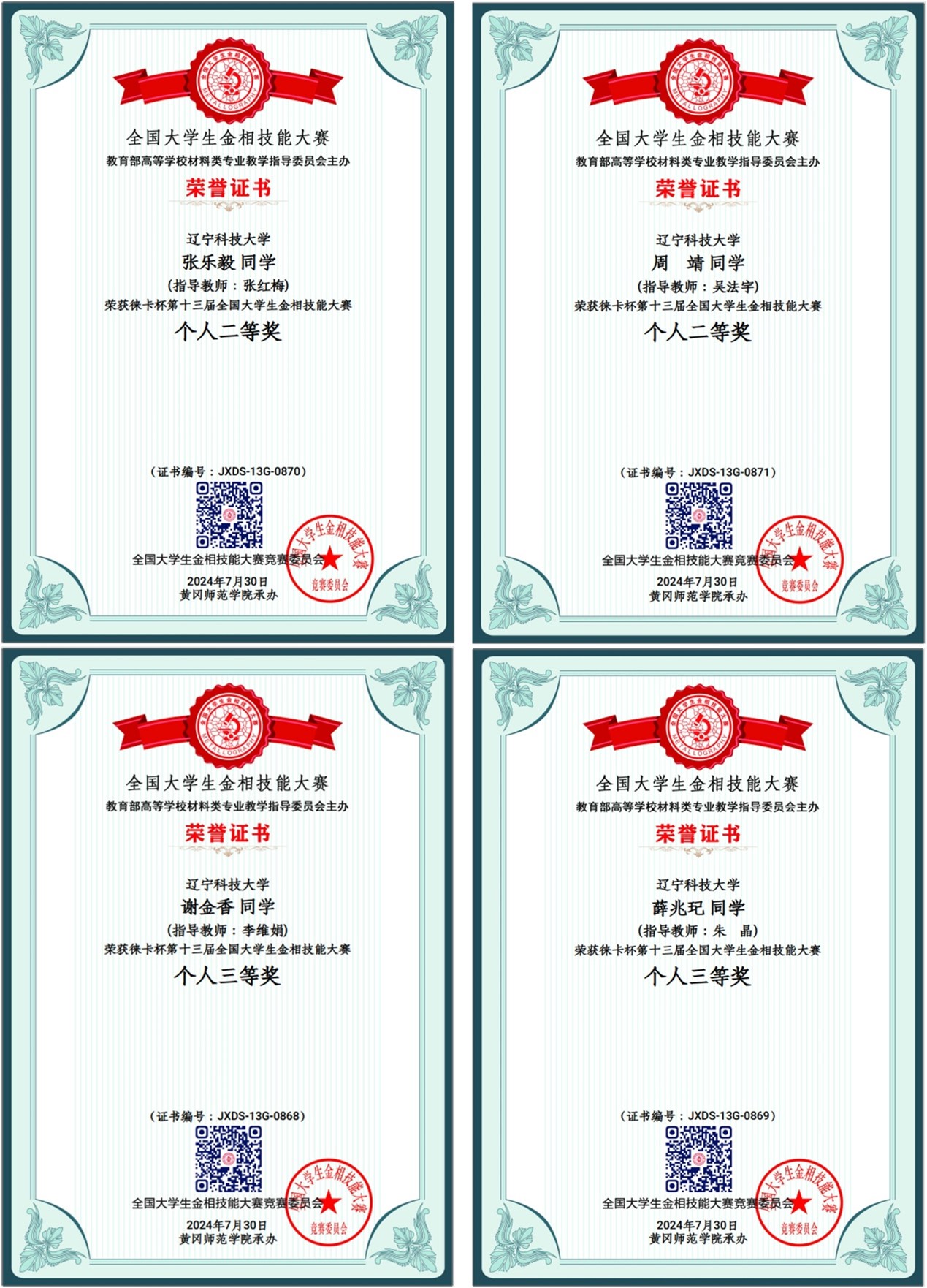 7月25日至30日,由教育部高等学校材料类专业教学指导委员会主办、黄冈师范学院承办的第十三届全国大学生金相技能大赛决赛在湖北黄冈举行。本次大赛分校内预赛、分区赛复赛和全国总决赛三个阶段。来自清华大学、上海交通大学、北京科技大学等531所大学的1898名选手同台竞技。经过多天激烈的角逐,8xbet手机客户端材冶学院学子凭借严谨的实验素养和沉着的竞技状态,最终荣获二等奖2项,三等奖2项。