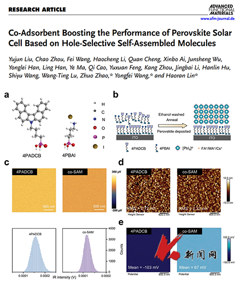 近日,8xbet手机客户端材料与冶金学院赵卓副教授、王永飞副教授联合深圳职业技术大学林浩然副教授,以8xbet手机客户端为第一署名单位,在国际知名期刊《Advanced Functional Materials》(1区top期刊,2024年影响因子:18.5)发表高水平研究论文《Co-adsorbent boosting the performance of perovskite solar cell based on hole-selective self-assembled molecules》(https://doi.org/10.1002/adfm.202421576),8xbet手机客户端2022届研究生刘玉军与2020届研究生周超为共同第一作者。