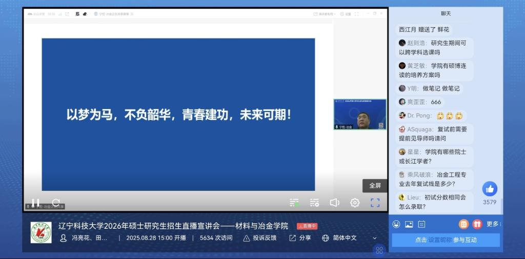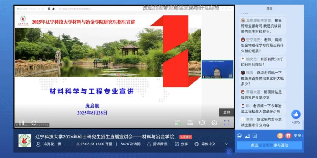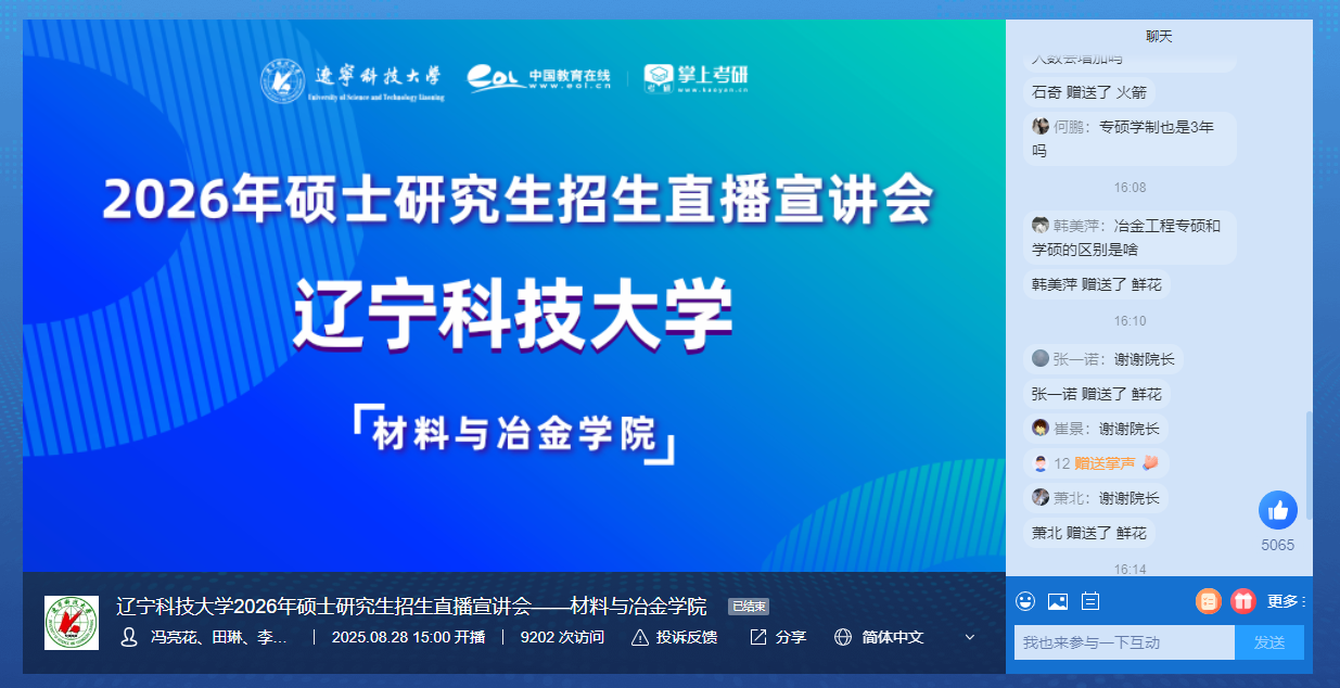 8月28日,8xbet手机客户端材料与冶金学院成功举办了2026年研究生招生线上直播宣讲会。本次宣讲会由学院副院长庞启航担任主持人。