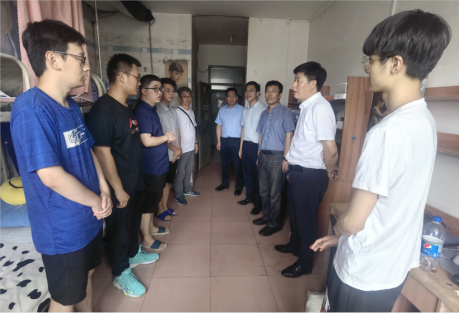 在走访过程中,与同学们亲切交谈,询问了同学们的生活情况、毕业去向以及未来规划,与他们畅叙大学四年学习生活。领导班子一行勉励同学们在毕业后继续努力学习,积极进取,争取获得更大成就;鼓励暂时还未明确工作岗位的同学们保持积极心态,放宽眼界,调整就业思路,再提升学历、就业工作、自主创业各种路径寻找适合自己的道路。针对毕业生在学习、生活、就业、升学中遇到的问题与困难,领导班子一行现场答疑解惑,并积极协调资源解决问题,同时要求毕业班辅导员、学生党员、学生干部发现身边的同学面临就业困难、情感问题、焦虑情绪等,及时给予关心帮助。领导班子一行为即将踏上人生新征程的毕业学子送上温馨祝福和美好期望,希望同学们在实践中锻造自己,用实际行动回报学校和社会,并欢迎大家常回母校。同学们真诚表达了自己对学校的留恋与不舍,感谢学校培养,纷纷表示将谨遵教诲,不负期望,牢记“博学明德 经世致用”的校训精神,通过扎实的奋斗积极为社会创造价值。