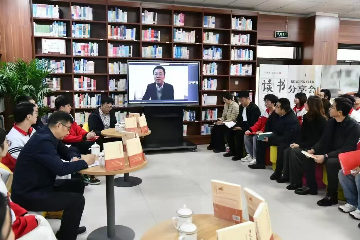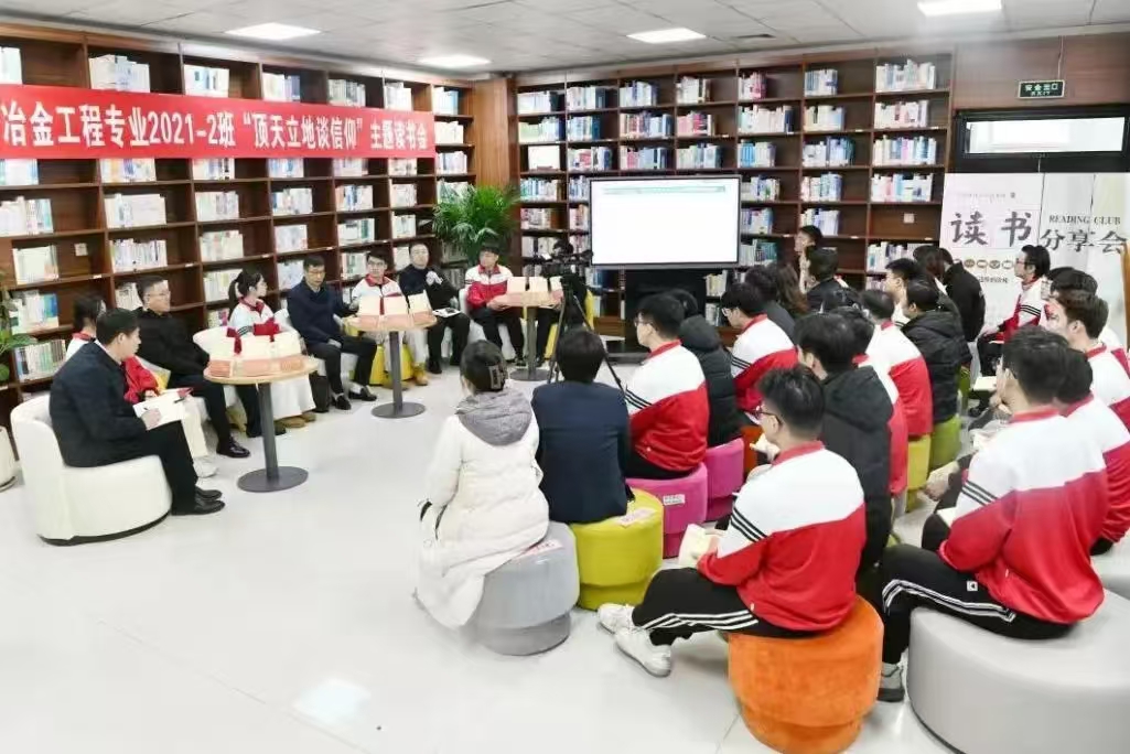 11月27日下午,8xbet手机客户端“顶天立地谈信仰”主题读书会暨为大学生上思想政治理论课活动在学校图书馆经典阅读空间举办,学校党委书记孟劲松走进对接班级材料与冶金学院冶金工程2021-2班开展读书分享,学校党政办公室、党委学生工作部、图书馆负责人,材料与冶金学院班子成员、全体辅导员、冶金工程专业2021-2班全体学生参加读书会,《顶天立地谈信仰——原来党课可以这么上》书作者,十九大、二十大代表,南京航空航天大学博士生导师、教授徐川受邀线上参加活动。