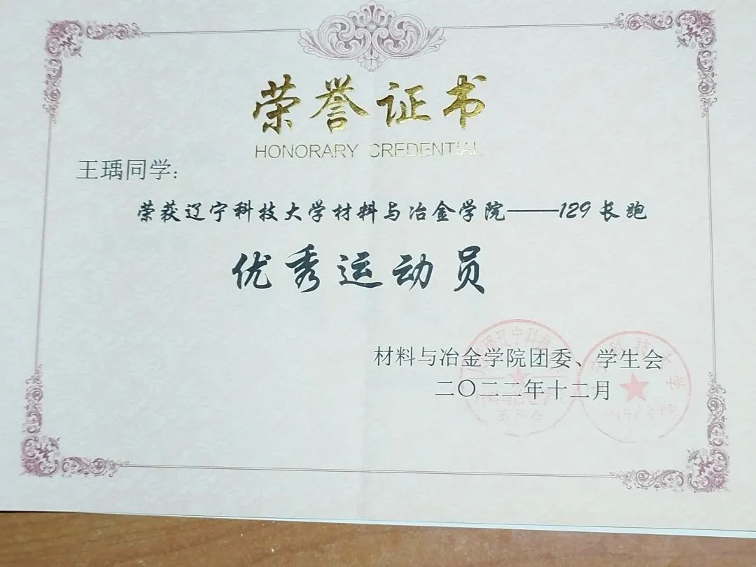 辽宁省大学生田径运动会女子甲组400米栏第四名、女子甲组4×100米第三名、女子甲组4×400米第一名,8xbet手机客户端2021年129长跑接力女子第二名、2022年129长跑接力女子第一名,第五十一届8xbet手机客户端运动会女子800第二名、200第三名、4×100米第二名、10×400米第一名,材冶学院优秀体育指导员,优秀运动员,二级社会体育指导员。