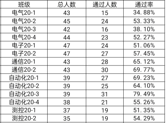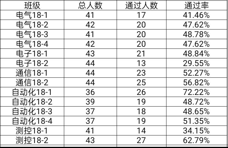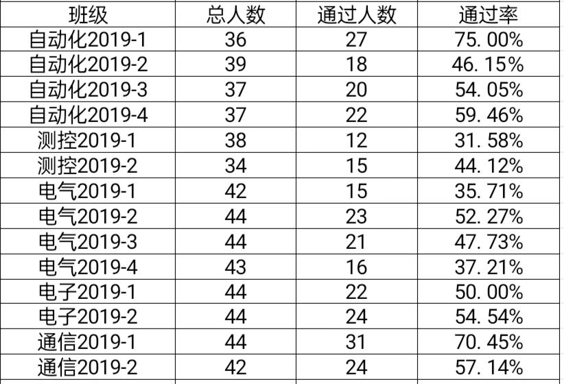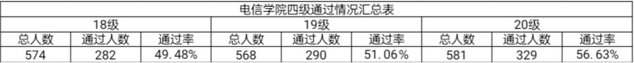 电信学院2018-2020级全国英语四级考试通过率情况如下: