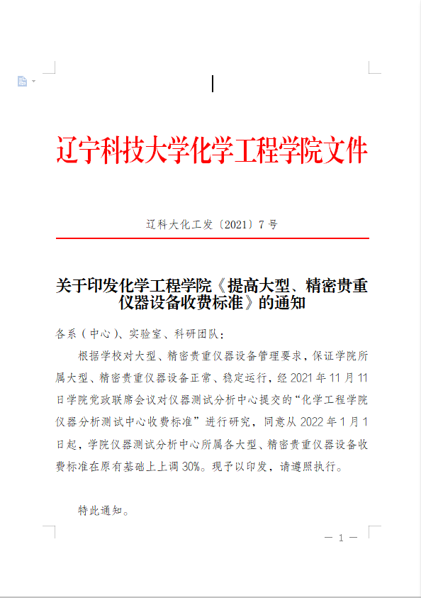 关于印发化学工程学院《提高大型、精密贵重仪器设备收费标准》的通知