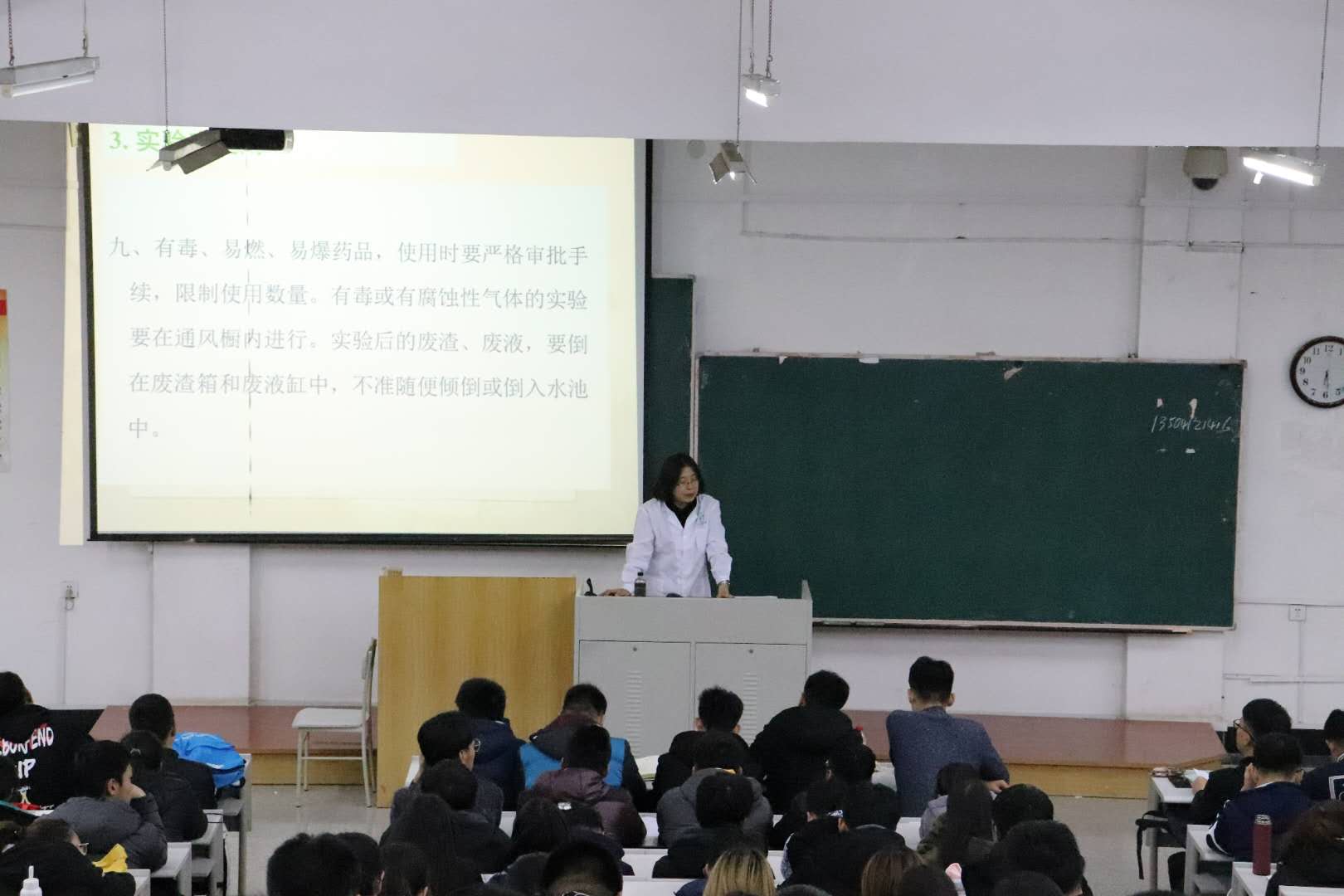 讲座主要以安全第一为核心,讲述了在实验室应如何规范操作,才能避免造成人身伤害和财务损失。当进行有危险性的实验时,应先检查防护措施,确认妥当后,才可以进行实验。接着,全老师讲述了实验守则,提到了在实验中同学们应严格遵守实验室各项规章制度,听从指导教师和实验技术人员的指导,提倡独立思考、科学操作、细致观察、如实记录,自觉培养严谨、求实的科学作风和生动活泼、勇于探索创新的学风。为了让大家对危险化学品有更明确的分类概念,全老师还为大家讲解了易制毒化学品和易制爆化学品,拓展同学们的知识面。最后发给各班同学“2019年化学工程实验中心安全教育”试题,让同学们在结束讲座后对安全知识进行进一步巩固。