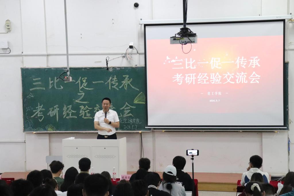 为加强学院学风建设,帮助同学们积极备考研究生,化工学院于5月7日在博学楼c302举办了三比一促一传承之考研经验交流会。学院辅导员、6名经验分享同学及200余名同学参会。
