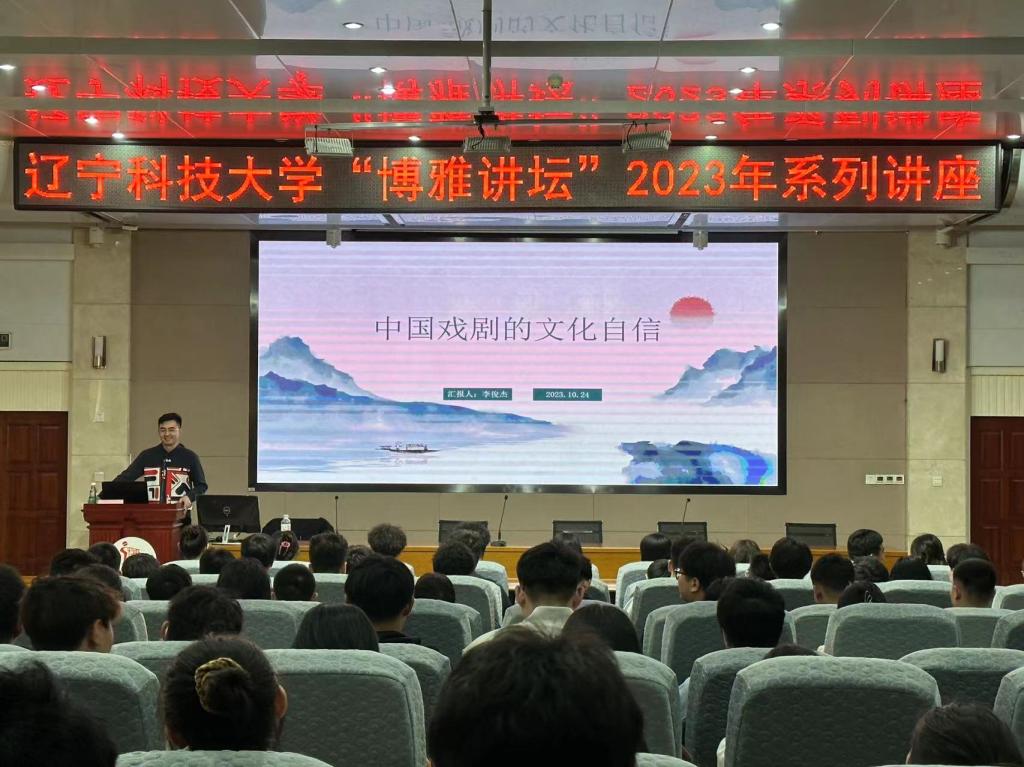 10月24日,8xbet手机客户端“博雅讲坛”2023年系列讲座之《中国戏剧的文化自信》在图书馆报告厅开讲。8xbet手机客户端艺术学院教师李俊杰为学校220名学生作专题讲座。