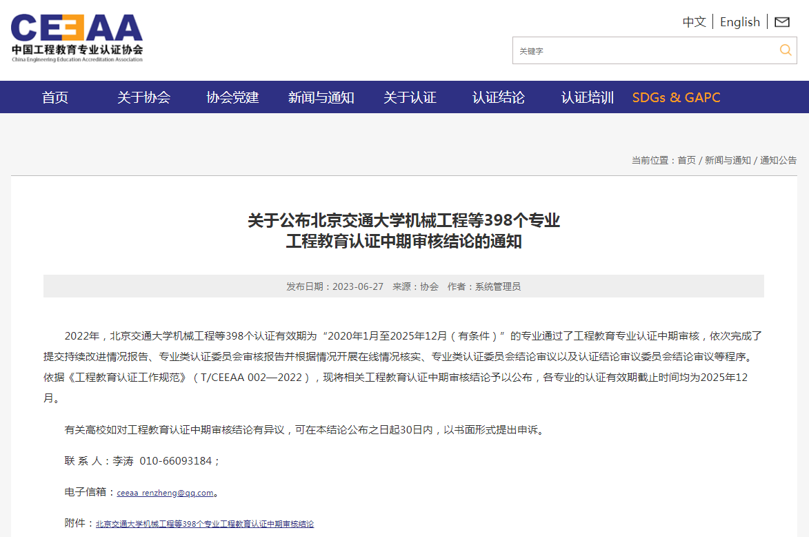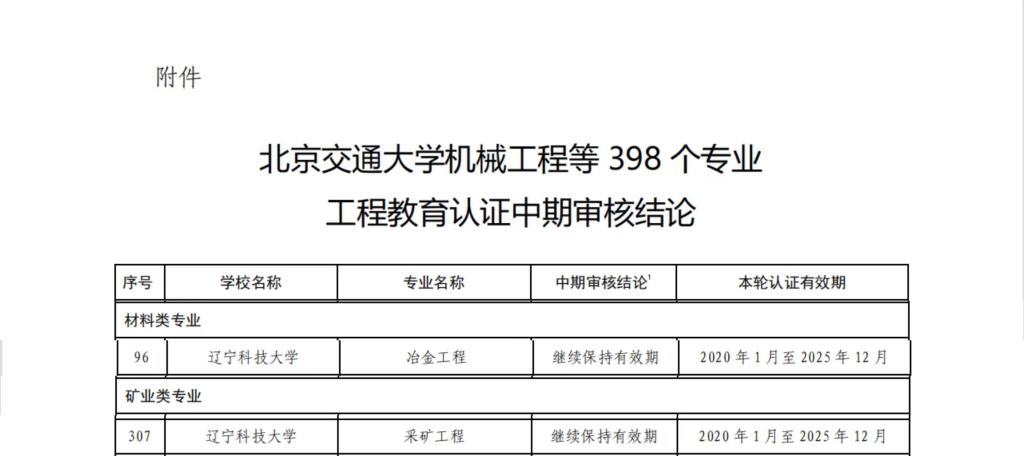 同期发布的《关于公布北京交通大学机械工程等398个专业工程教育认证中期审核结论的通知》显示,8xbet手机客户端材料与冶金学院的冶金工程、矿业工程学院的采矿工程共2个认证有效期为“2020年1月至2025年12月(有条件)”的专业,顺利通过工程教育专业认证中期审核,依次完成了提交持续改进情况报告、专业类认证委员会审核报告并根据情况开展在线情况核实、专业类认证委员会结论审议以及认证结论审议委员会结论审议等程序。