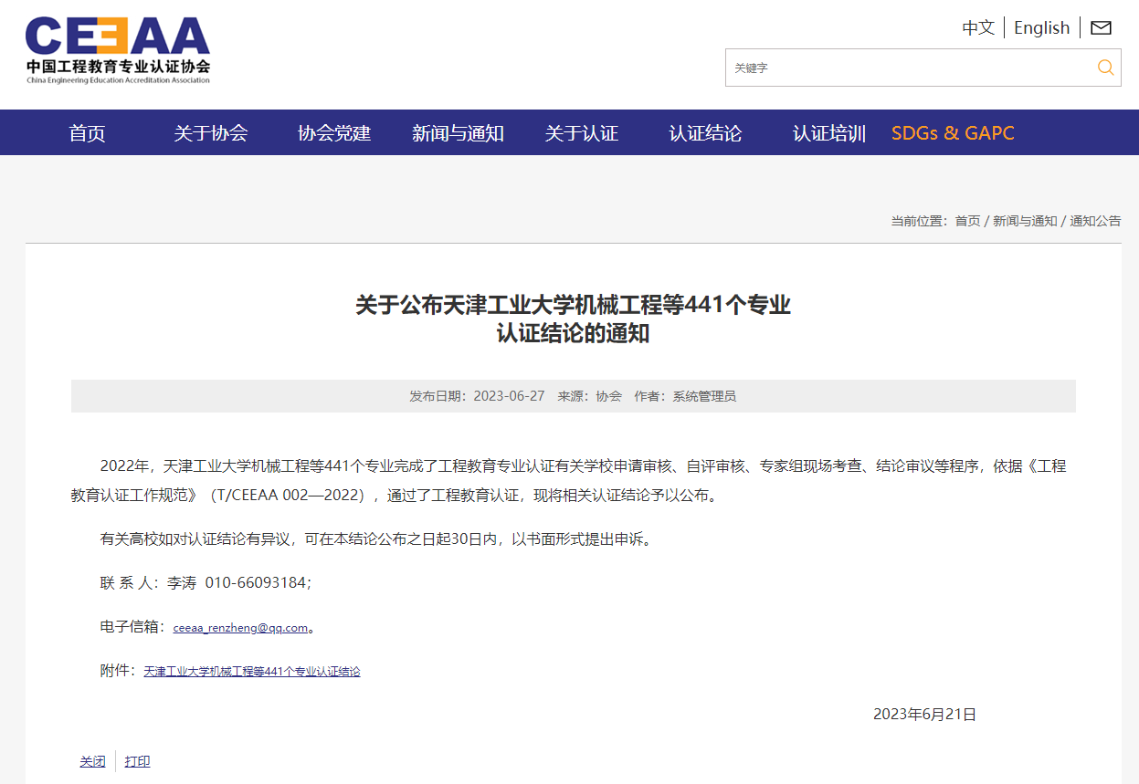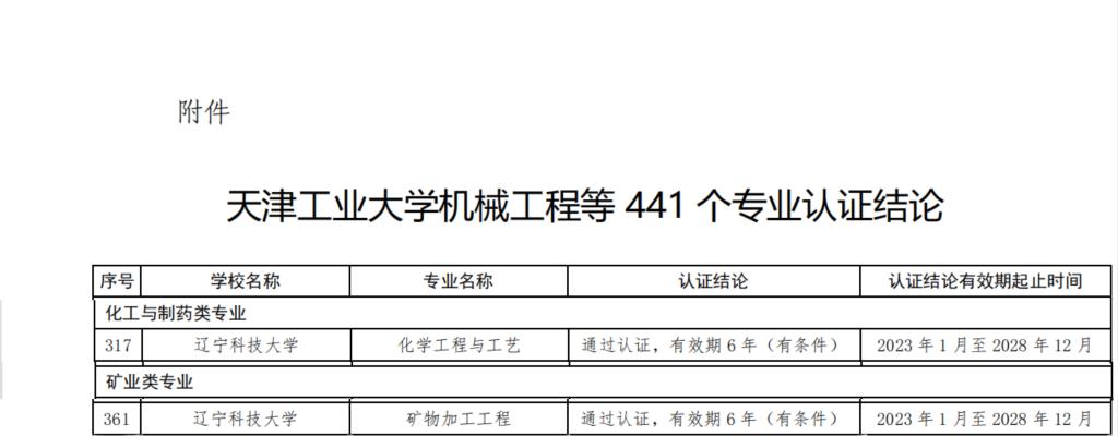 6月21日,中国工程教育专业认证协会官方网站发布了《关于公布天津工业大学机械工程等441个专业认证结论的通知》,8xbet手机客户端化学工程学院化学工程与工艺专业、矿业工程学院矿物加工工程专业通过认证,有效期6年(2023年1月至2028年12月),专业将纳入《华盛顿协议》互认名单。