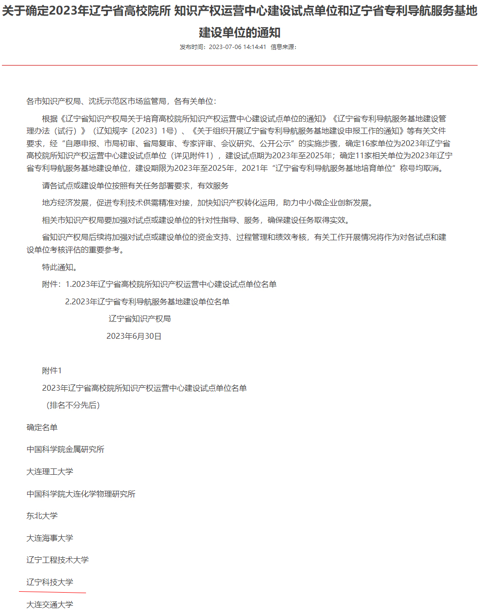 今年5月22日,辽宁省知识产权局下发《关于培育高校院所知识产权运营中心建设试点单位的通知》,文件要求申报辽宁省高校院所知识产权运营中心建设试点工作的单位需结合工作实际,聚焦提升高校院所知识产权运营能力,探索完善以市场需求为导向的科技成果和知识产权运营对接机制,着力解决高校院所专利技术运营难、中小微企业技术获取难的“两难”问题,尽快形成有益经验。