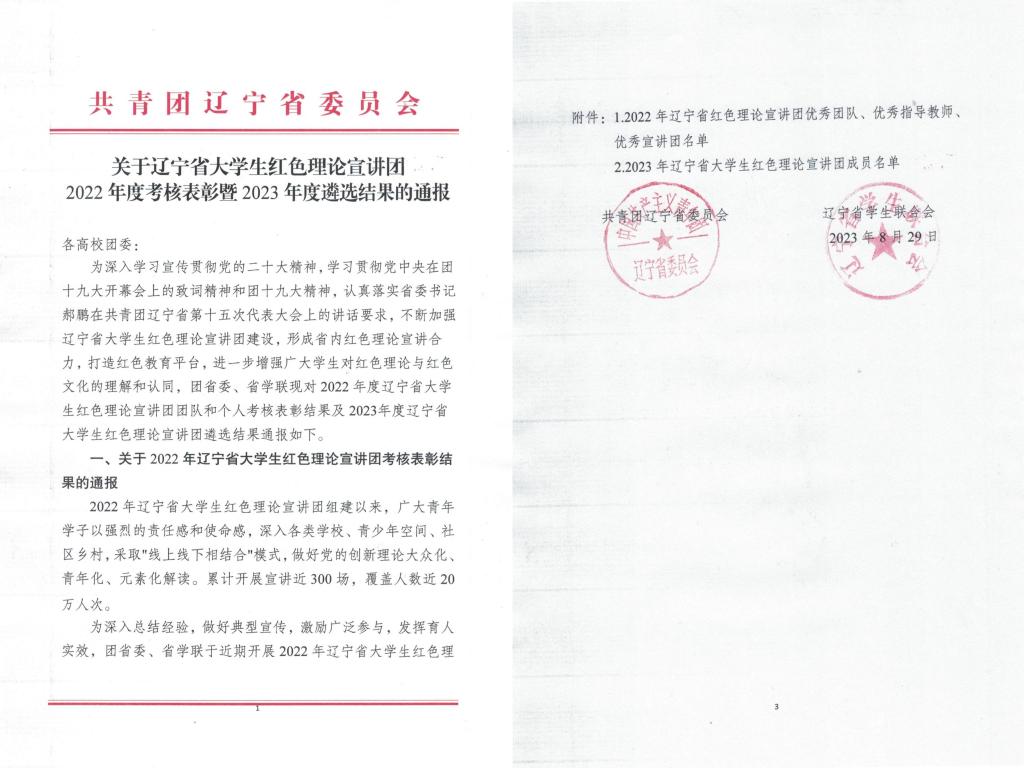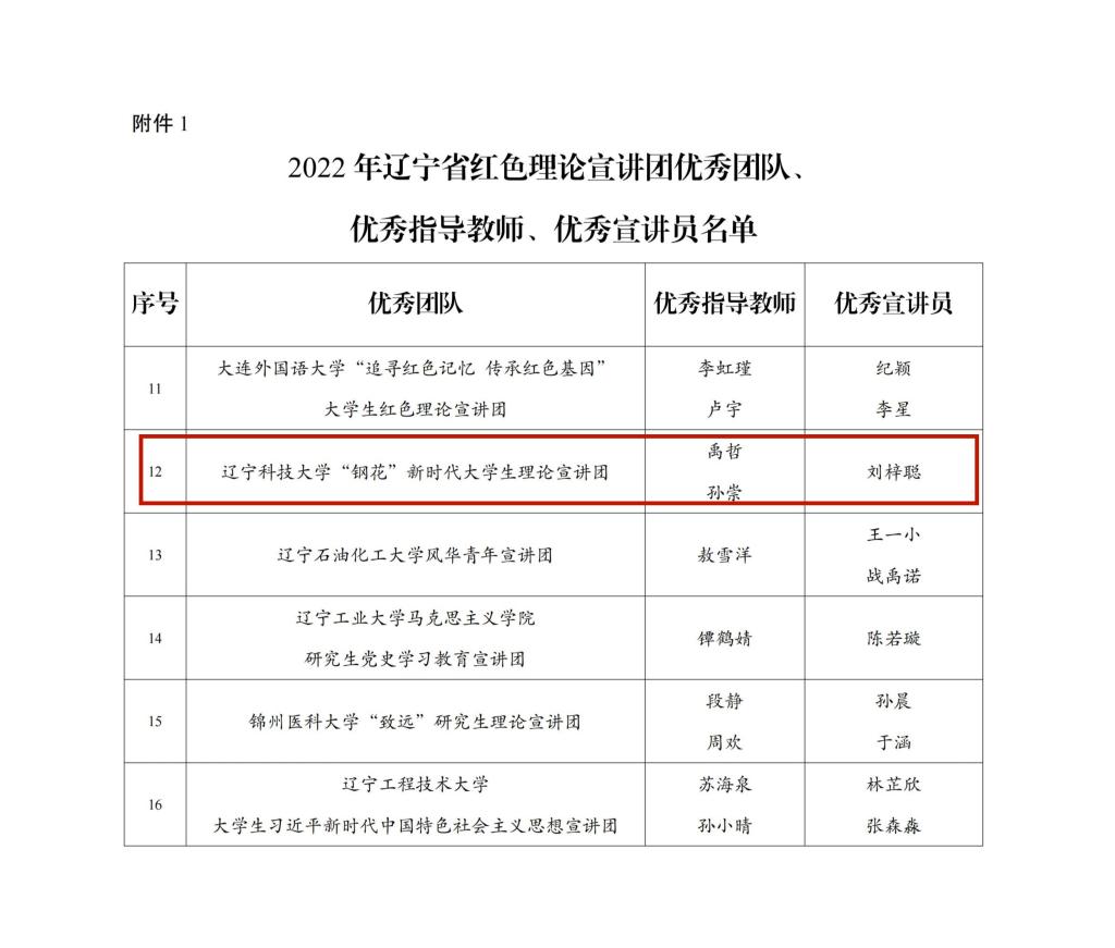 近日,共青团辽宁省委员会、辽宁省学生联合会联合通报2022年辽宁省大学生红色理论宣讲团考核表彰结果,8xbet手机客户端“钢花”新时代大学生理论宣讲团获评2022年辽宁省大学生红色理论宣讲团优秀团队。宣讲团负责人刘梓聪获评“优秀宣讲员”荣誉称号。