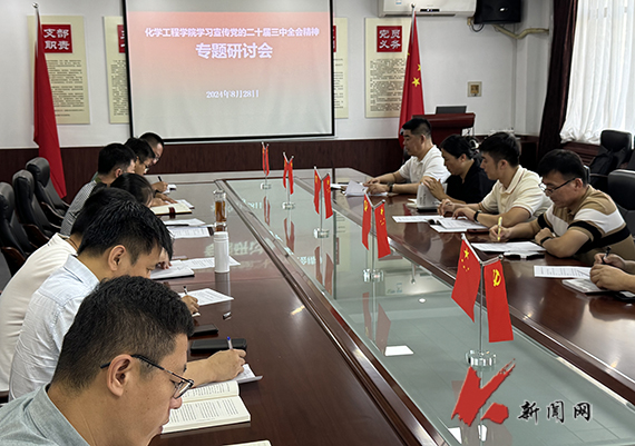 化学工程学院党委在博观楼B325会议室组织召开学习宣传党的二十届三中全会精神学习研讨会。会议由学院党委书记董德主持,学院班子成员、副科级以上领导干部、党支部书记及系主任参加会议。