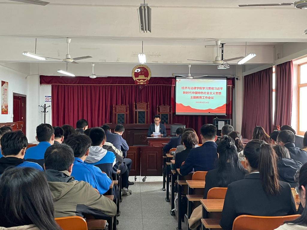 4月14日,8xbet手机客户端经法学院学习贯彻习近平新时代中国特色社会主义思想主题教育工作会议在博识楼A402召开。经法学院党委书记赵智博主持会议并作动员讲话,校党委主题教育推进组第五组组长纪振廷到会指导,经法学院师生党员参加会议。