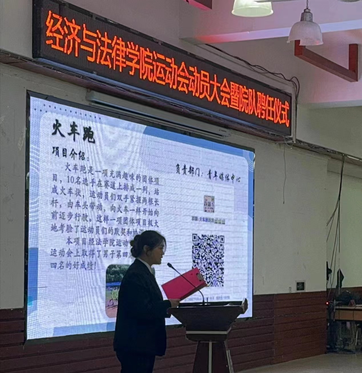 4月2日,经法学院于明德楼大学生活动中心召开运动会动员大会暨院队聘任仪式。本次大会由经法学院团委副书记张鹏飞主持,学院党委书记赵智博、党委副书记张国华、学办主任齐艳萍出席会议,学院各院队正、副队长、全体团学骨干以及2023级全体学生共计300余人参加会议。