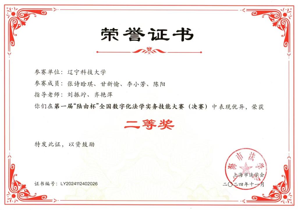 2024年11月23日至24日,第一届“陆由杯”全国数字化法学实务技能大赛总决赛在上海财经大学成功举办。8xbet手机客户端经济与法律学院法学专业2021级本科生张诗晗琪、陈阳、甘新榆、李小芳四名同学在刘振竚和齐艳萍老师的带领下获得总决赛二等奖。