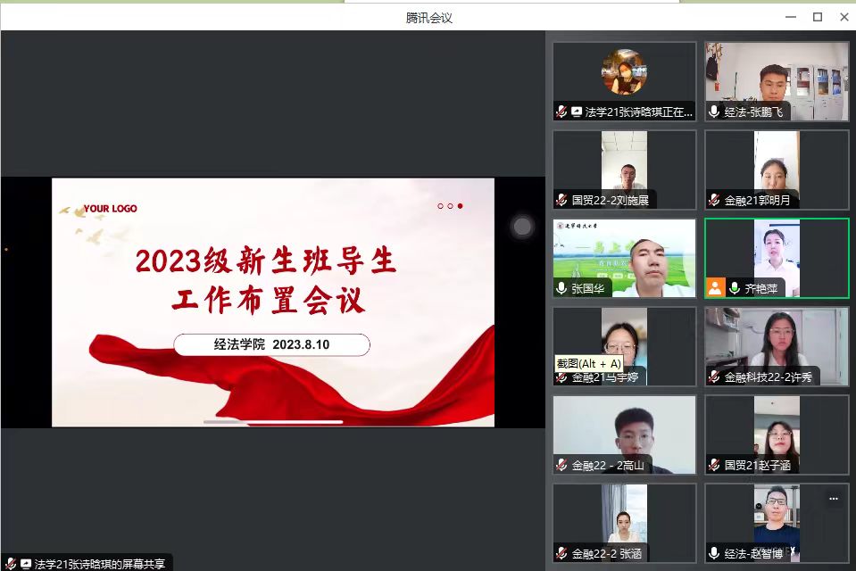 8月10日上午,经法学院通过腾讯会议召开2023级新生班导生工作布置会议。经法学院党委书记赵智博、党委副书记张国华、学办主任齐艳萍及团委副书记张鹏飞出席会议,全体2023级新生班导生参加了本次会议。