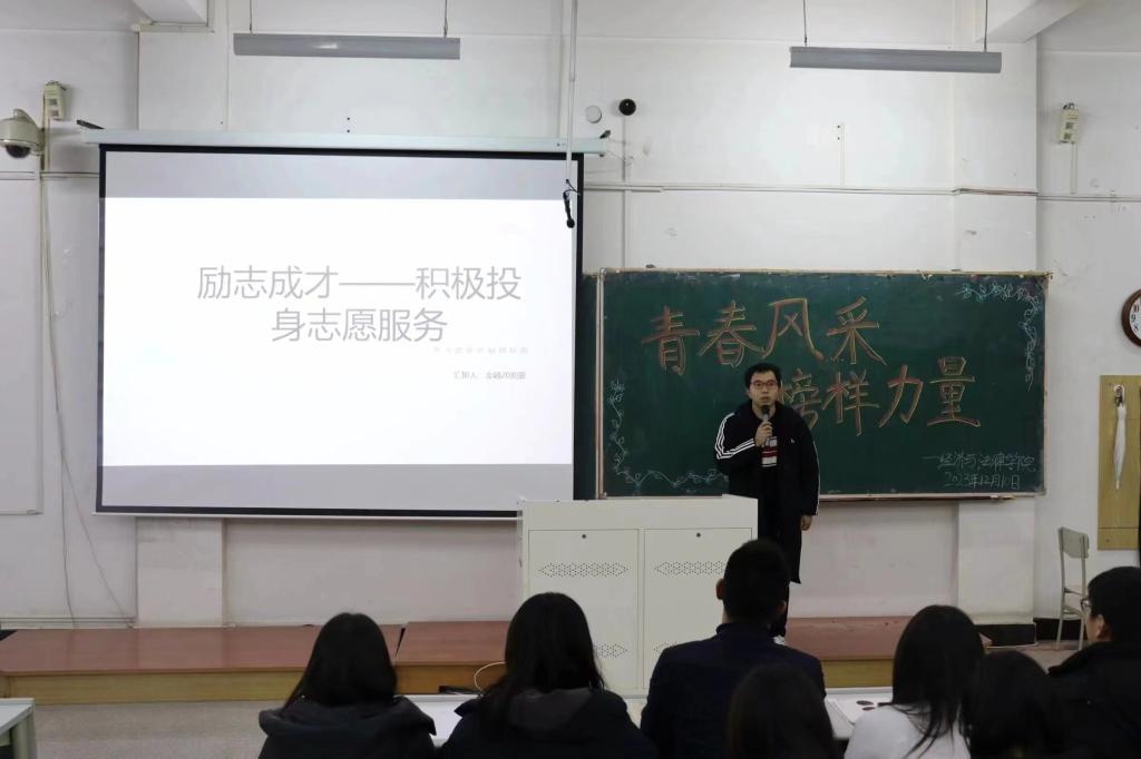 12月10日,经法学院于博学楼C102开展“青春风采 榜样力量”主题宣讲会。学院优秀学生代表2023年钢铁标兵年度人物代郁璇、十佳大学生张诗晗琪、道德楷模刘豪、十大学习标兵于澜受邀担任宣讲人,经法学院党委书记赵智博以及团学骨干出席会议,学院2022级、2023级350名本科生参加会议。
