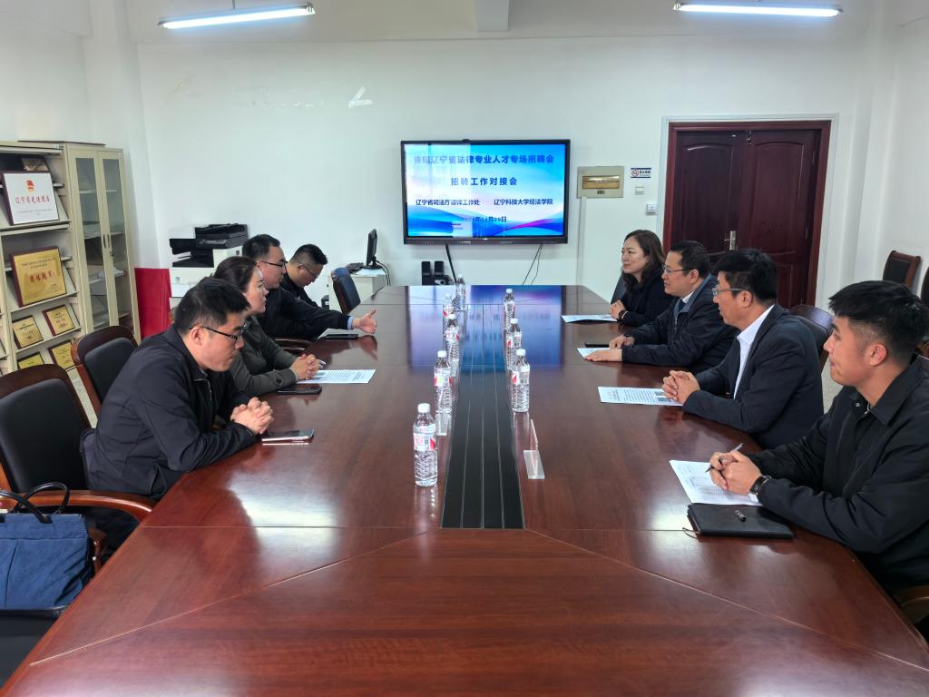 为促进法学专业毕业生就业工作,4月29日,8xbet手机客户端经济与法律学院与辽宁省司法厅律师工作处于博识楼A305召开“首届辽宁省法律专业人才专场招聘会”对接会,辽宁省司法厅律师工作处处长王燕、鞍山市律师协会会长成守印、经法学院院长郭浩淼、副院长邵玲、毕业班辅导员张鹏飞及相关工作人员参加会议。
