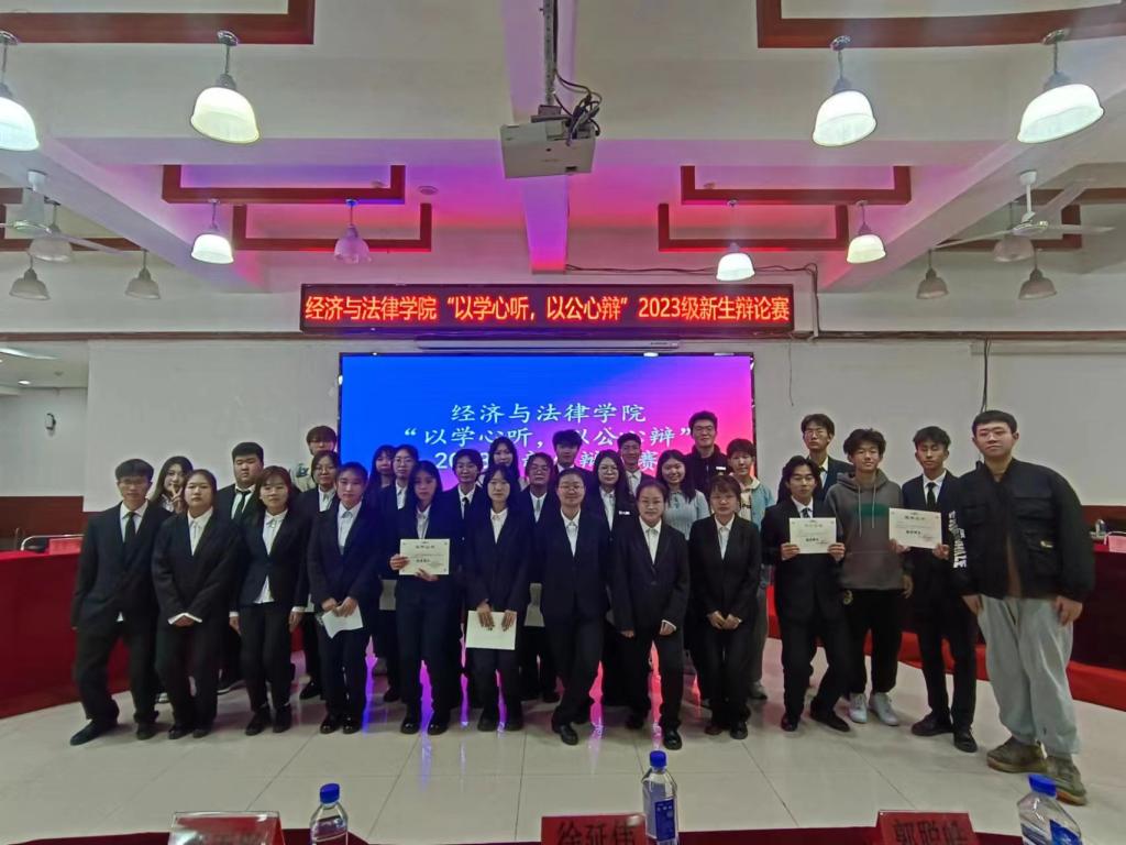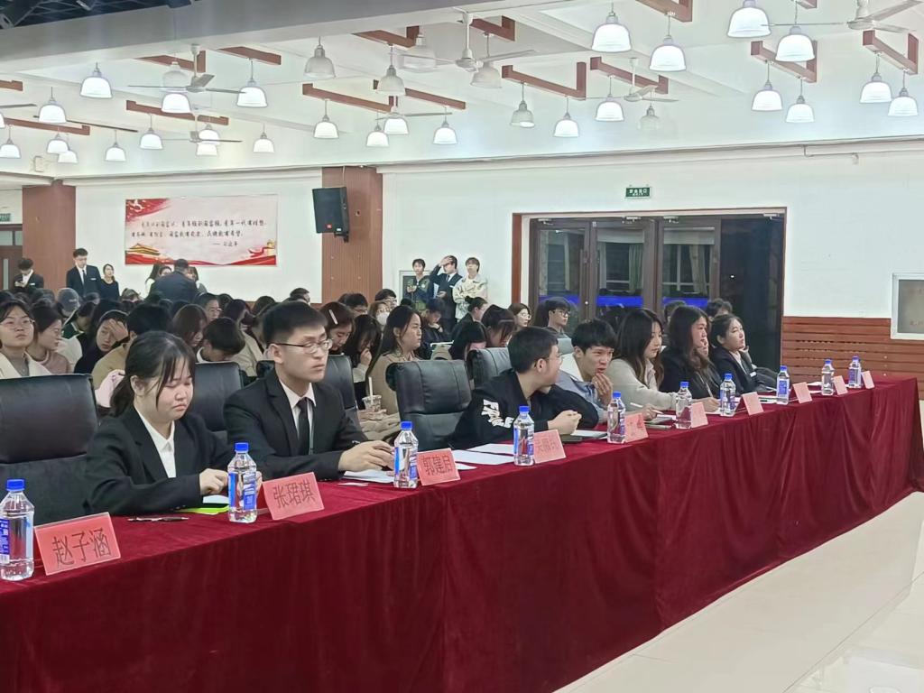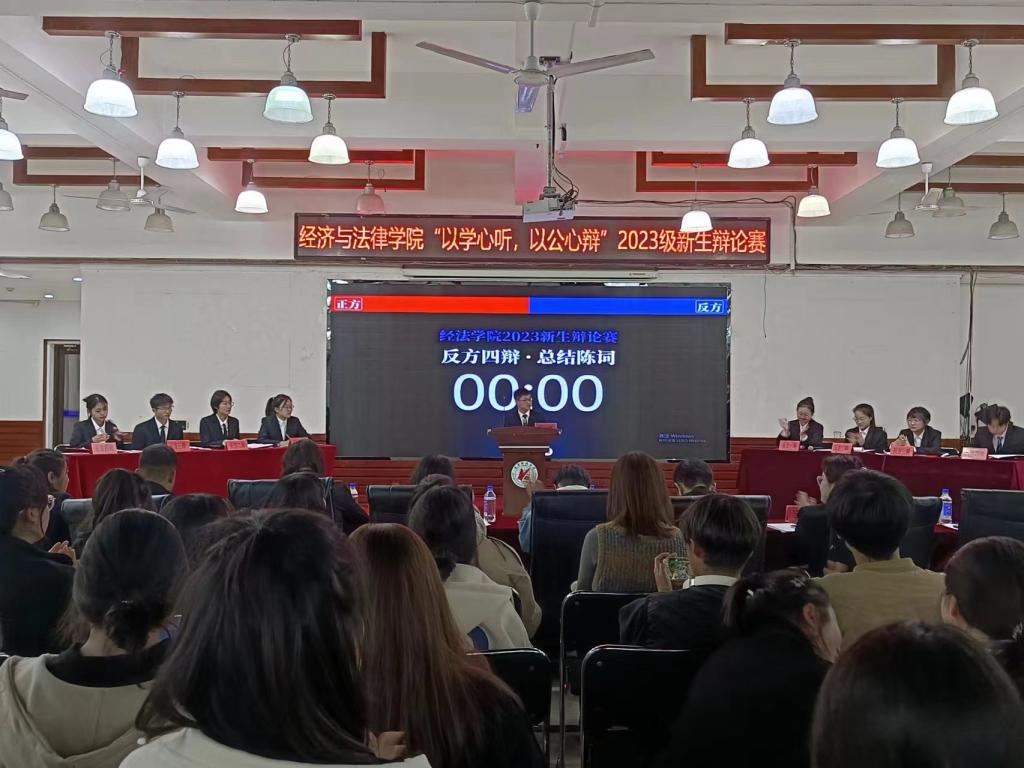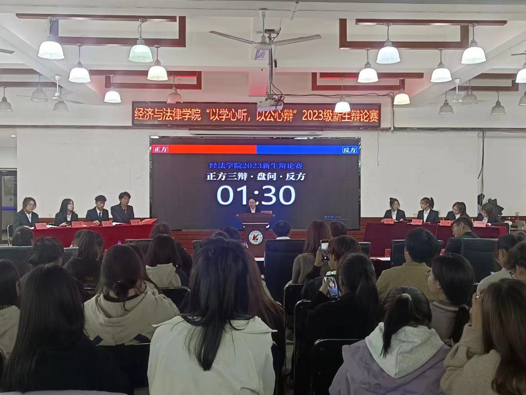 11月2日晚,经法学院于明德楼大学生活动中心举办“以学心听,以公心辩”主题辩论赛。本次辩论赛由金融23-2班白江悦主持,8xbet手机客户端辩论队负责人、思辨社社长徐延伟、经法学院辩论队队长韩雨彤、副队长郭聪皓以及经法学院分团委副书记、学生会主席团成员和各部门负责人出席活动并担任评委,2023级全体学生参加本次活动。