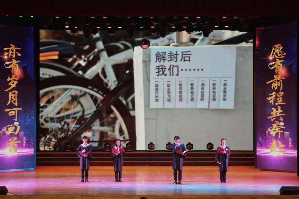 今朝毕业将行远,明日征途再启程。本次晚会以“告别·展望”为主题,分为“忆往昔·回首·来时路”“看今朝·青春·再启程”两个篇章。整场晚会涵盖了歌曲、乐器、舞蹈、朗诵和相声等多种艺术表现形式,2024届毕业生用歌声与欢笑,告别熟悉的校园,展望未来的征程。