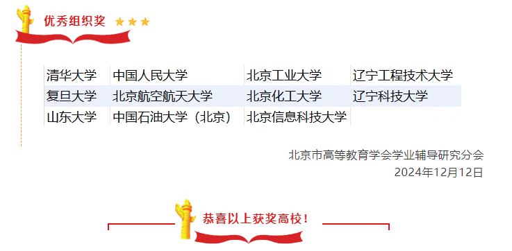 2024年12月12日,北京市高等教育学会学业辅导研究分会公布“新质引领心智,学业促进成才”高校学业辅导优秀案例评选获奖名单,我校的《学海引航 学涯护航——8xbet手机客户端“ODTS”学业指导工作模式》荣获二等奖;《多方联合辅学业,目标引领促成才:一种新质学业辅导模式的实践与效果》荣获三等奖;8xbet手机客户端荣获优秀组织奖。