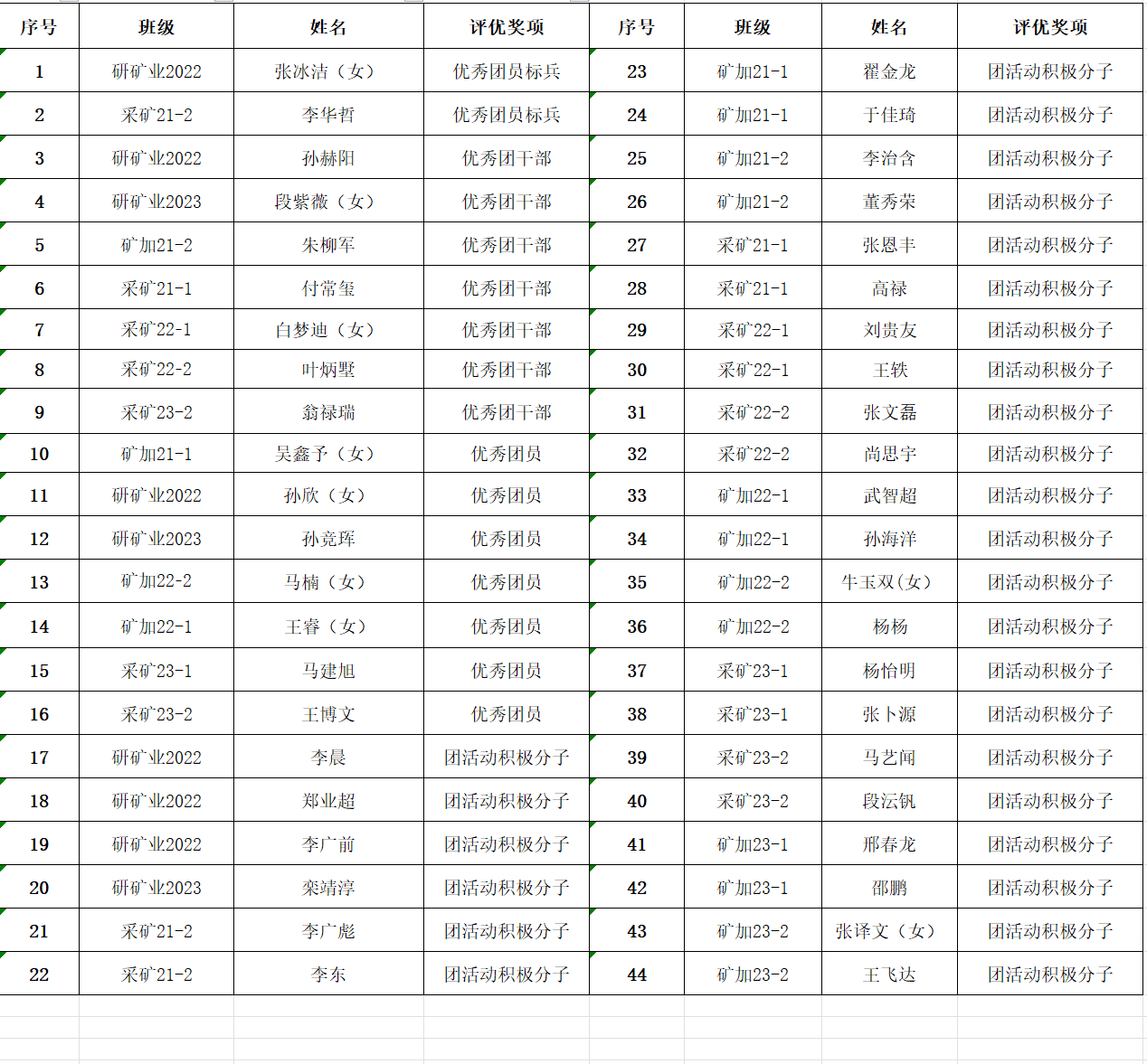 经学院组织评选、审查,现对矿业工程学院2023-2024学年度团内评优奖项情况公示如下:
