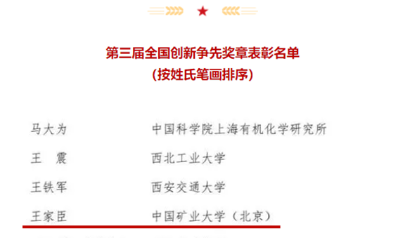 2023年5月30日,人力资源和社会保障部、中国科协、科技部、国务院国资委决定授予王家臣同志等26名同志第三届全国创新争先奖章并享受省部级表彰奖励获得者待遇。