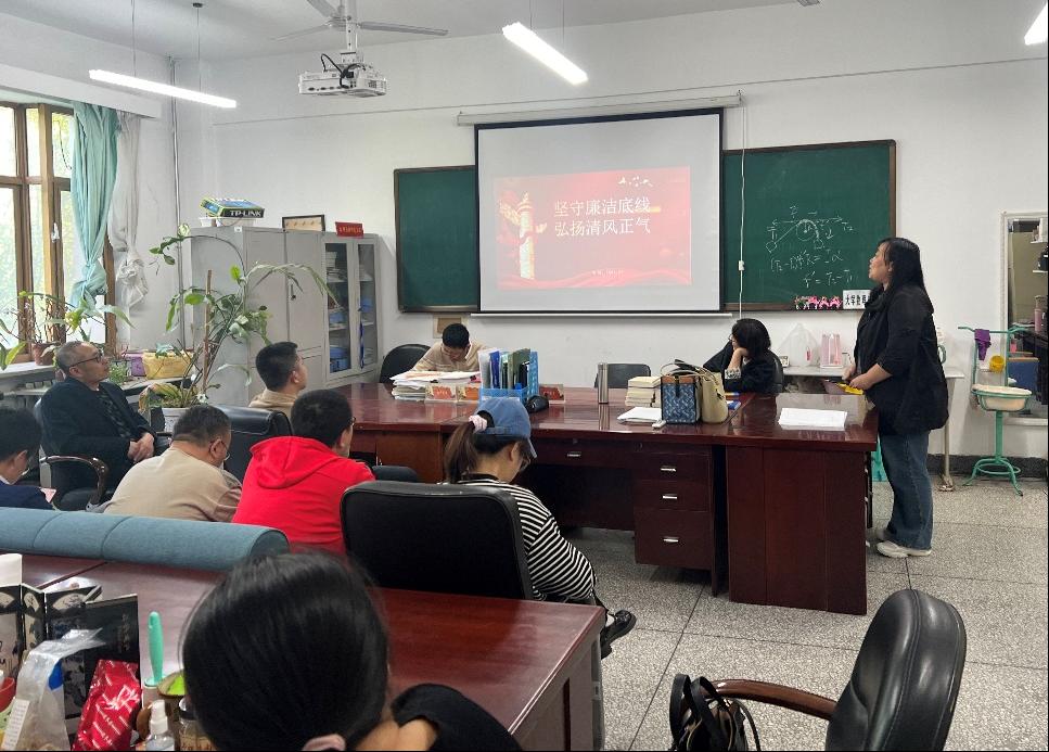 会议第二项由支部纪检委员谷月同志进行本年度廉政教育,主题为《坚守廉政底线、弘扬清风正气》。她从老英雄张富清的事迹和周总理“三付饭费”的故事开始,为党员们讲解“清正廉洁”的重大意义,如何理解“清正廉洁”的时代价值,以及永葆“清正廉洁”的政治本色。