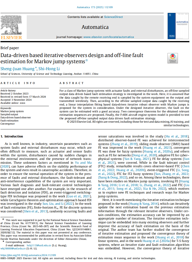 8xbet手机客户端“数学方法与智能控制理论”团队首次在该顶级期刊发表学术成果“Data-driven based iterative observers design and off-line fault estimation for Markov jump systems,Automatica,2025,173:112109”。该学术成果是由科研团队负责人黄胜绢(S.-J.Huang)教授及其指导的研究生李世鸿(S.-H.Li)合作完成。该学术成果主要针对一类具有马尔可夫跳变的控制系统,通过系统的离散采样输出数据,结合线性插值拟合方法构建了一种基于数据驱动的迭代观测器,实现了对系统的状态和故障的准确估计,从而完成对系统的远程故障诊断。同时,该学术成果提出了一种积分序列收敛性理论,确保逼近残差在一定条件下是收敛的,突破了传统故障估计方法只能确保逼近残差范数有界的局限,在确保系统安全性和可靠性方面有着重要的理论和应用价值。