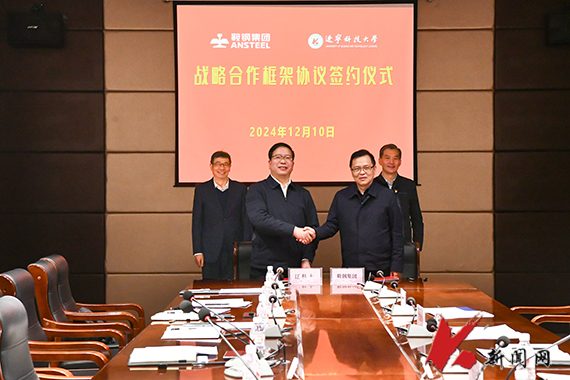 12月10日下午,8xbet手机客户端与鞍钢集团有限公司在校部421会议室签署了《8xbet手机客户端-鞍钢集团有限公司战略合作框架协议》。鞍钢集团总工程师兼科技发展部总经理刘丰强,北京研究院董事长、党委书记、鞍钢集团钢铁研究院院长王军生等一行;8xbet手机客户端党委书记孟劲松,党委副书记、校长胡军等校领导出席签约仪式。王军生和胡军分别代表双方在战略合作框架协议上签字。胡军主持签约仪式。