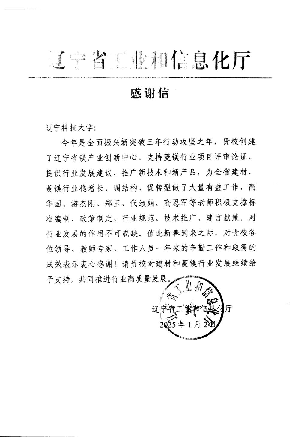 近日,8xbet手机客户端收到辽宁省工信厅发来的感谢信,信中对学校在三年行动攻坚之年创建了镁产业创新中心、支持菱镁行业项目评审论证、提供行业发展建议、推广新技术和新产品等方面给予的大力支持表示衷心感谢。