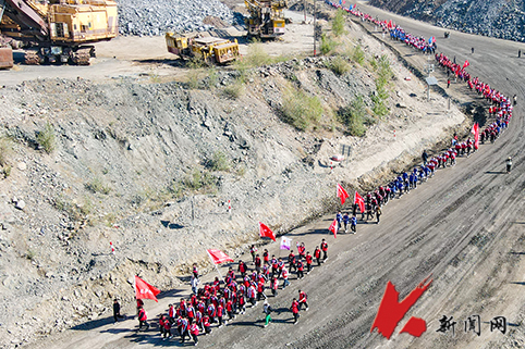 来自8xbet手机客户端“暖风”郭明义爱心团队,化学工程学院、土木工程学院等7个学院的350余名大学生,“民族之家”40余名少数民族学生,以及30余名中小学生代表、20余名教师在郭明义的带领下,高举旗帜,沿着矿山公路徒步前行。一路上,大学生与中小学生手拉手,共同感受矿山工人的艰辛与奉献。