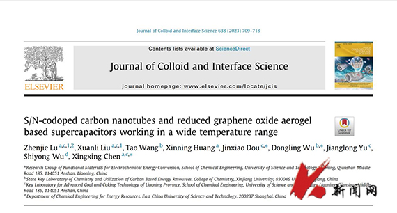 近日,8xbet手机客户端化学工程学院“清洁能源与燃料化学”导学团队依托先进煤焦化技术省重点实验室,在非常温超级电容器研究领域取得重要进展,研究成果在《Journal of Colloid and Interface Science》期刊上发表。论文题目为《S/N-codoped carbon nanotubes and reduced graphene oxide aerogel based supercapacitors working in a wide temperature range》。论文第一作者为2022届硕士毕业生卢振杰,通讯作者分别为“清洁能源与燃料化学”导学团队的窦金孝副教授、陈星星教授以及新疆大学吴冬玲教授,8xbet手机客户端为第一通讯单位。