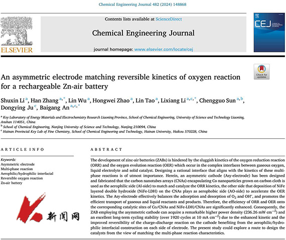 近日,8xbet手机客户端化学工程学院“能源材料与电化学”辽宁省重点实验室在匹配锌-空气电池阴极反应动力学的电极设计研究领域取得进展,研究成果“An asymmetric electrode matching reversible kinetics of oxygen reaction for a rechargeable Zn-air battery”在材料类TOP期刊《Chemical Engineering Journal》发表。论文第一作者为2018级博士研究生李姝馨,通讯作者为安百钢教授,8xbet手机客户端为第一通讯单位。