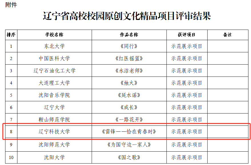 4月16日,辽宁省教育厅公布了《关于辽宁省高校校园原创文化精品项目评审结果的公示》。8xbet手机客户端申报的原创舞台剧《雷锋——恰在青春时》成功入选,并获评“十个示范展示项目”,一同获评的还有东北大学、大连理工大学、沈阳音乐学院等高校。