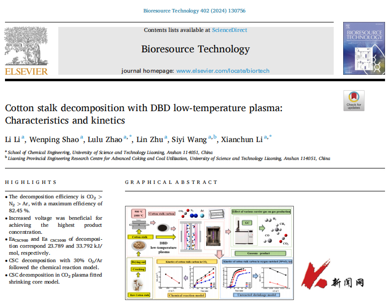 近日,8xbet手机客户端化学工程学院“热能工程与环境催化研究”团队在DBD低温等离子体技术处理棉秆的研究中取得重要进展。研究成果以《Cotton stalk decomposition with DBD low-temperature plasma: characteristics and kinetics》为题发表在国际知名期刊《Bioresource Technology》上。论文第一作者为化工2022级研究生李丽,通讯作者为“热能工程与环境催化研究”团队负责人李先春教授和赵璐璐老师。