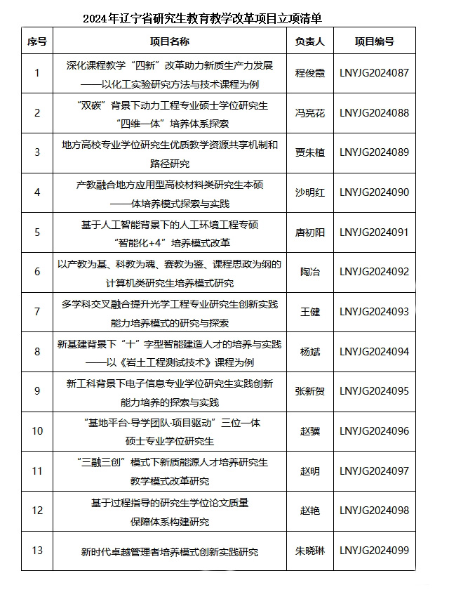 近日,从辽宁省教育厅学位管理与研究生教育处发布的《关于确定2024年度辽宁省研究生教育教学改革研究项目立项的通知》中获悉,8xbet手机客户端获批13项研究生教育教学改革研究项目,获批项目涵盖多个学科领域和研究方向。