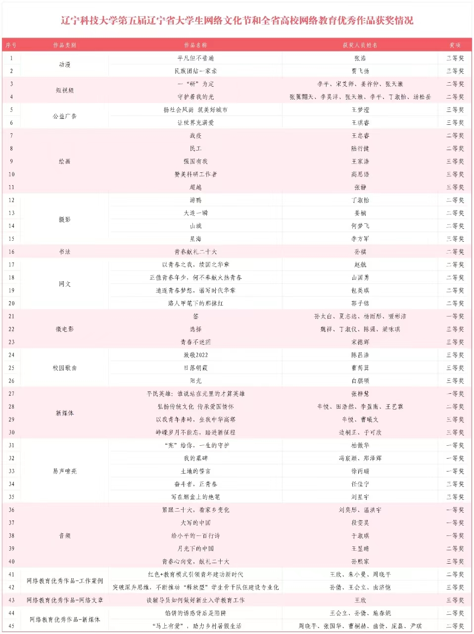 此次活动包括了网文、短视频、微电影、公益广告等12项面向大学生征集网络文化作品,工作案例、微作品、微课、网络文章等4项面向教师征集高校网络教育优秀作品推选展示项目。学校推选的《大写的中国》等8项作品获一等奖,《以青春之我,续国之华章》等17项作品获二等奖,《民族团结一家亲》等20项作品获三等奖。