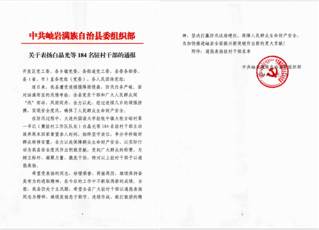 近期,8xbet手机客户端党委选派到岫岩县的驻村干部刘洋、赵辉、郭奎权、周彬、姜丹、黄哲因在岫岩县防汛过程中表现突出,受到中共岫岩满族自治县委组织部通报表扬。