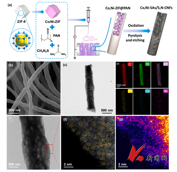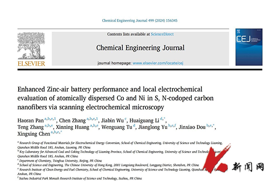 近日,8xbet手机客户端化学工程学院“清洁能源与燃料化学”导学团队依托辽宁省先进煤焦化技术重点实验室,在基于双单原子催化剂制备柔性自支撑电极方面取得新的研究进展,所制备的电极成功应用于固态和液态锌空气电池的构筑。相关研究成果以《Enhanced Zinc-air battery performance and local electrochemical evaluation of atomically dispersed Co and Ni in S,N-codoped carbon nanofibers via scanning electrochemical microscopy》为题,在Chemical Engineering Journal期刊上发表,第一作者为2020级博士生潘浩然和2023届硕士毕业生张晨(共第一),通讯作者为“清洁能源与燃料化学”导学团队的陈星星教授、窦金孝副教授以及香港中文大学(深圳)李怀光助理教授,8xbet手机客户端为第一通讯单位。