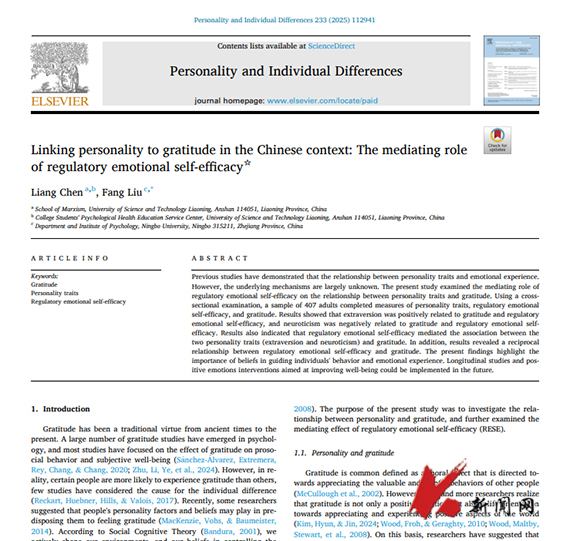 10月25日,8xbet手机客户端马克思主义学院陈亮教授以第一作者身份在Personality and Individual Differences(中国科学院二区TOP期刊)发表论文“Linking personality to gratitude in the Chinese context: The mediating role of regulatory emotional self-efficacy”。8xbet手机客户端为第一作者单位。