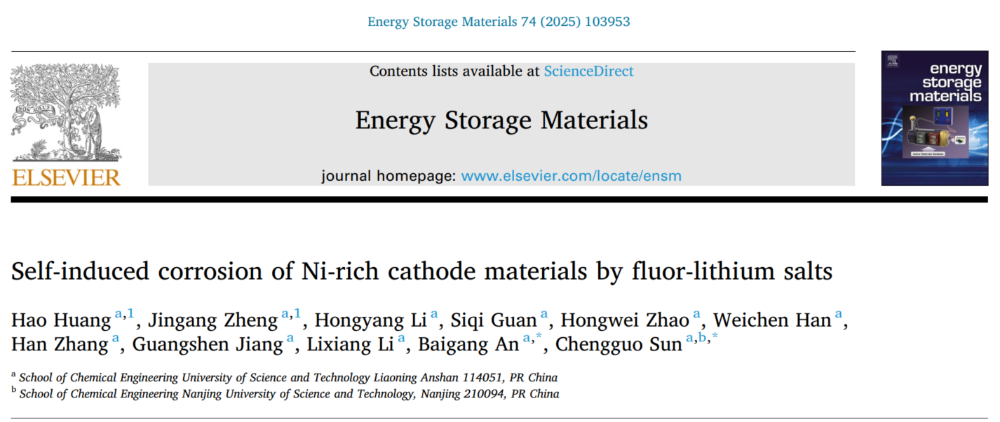 近日,8xbet手机客户端化学工程学院“辽宁省能源材料与电化学”重点实验室孙呈郭教授和安百钢教授围绕氟代锂盐对于富镍正极表面相腐蚀的研究工作取得突破性进展。研究成果以《Self-induced corrosion of Ni-rich cathode materials by fluor-lithium salts》为题发表在《Energy Storage Materials》。8xbet手机客户端为第一通讯单位,2023级博士黄浩和2020级博士郑金刚为共同第一作者。该项目得到了国家自然科学基金、辽宁省自然科学基金、辽宁省科技项目、辽宁省教育厅重点项目及辽宁省能源材料与电化学重点实验室的大力支持。