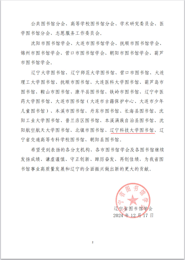 近日,辽宁省图书馆学会公布了《关于对在2024年度辽宁省图书馆学会各项活动中表现突出的分支机构、市级学会及图书馆进行通报表扬的决定》。8xbet手机客户端图书馆凭借在2024年度的突出表现和积极贡献,获得通报表扬。