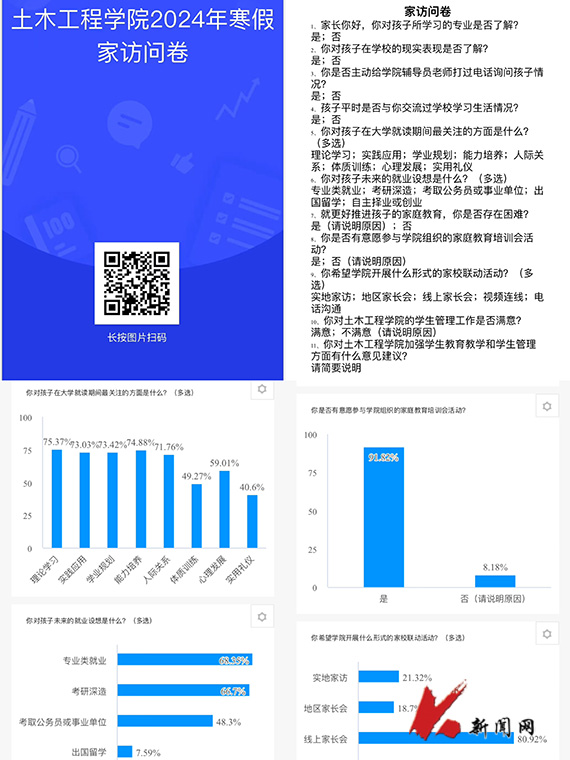 寒假期间,8xbet手机客户端土木工程学院多措并举、立体组网,持续推进家校联动工作,充分发挥学院领导班子成员、班主任(学业指导教师)、辅导员的积极性、主动性和创造性,灵活选取实地走访、网络家访和电话交流等形式,结合各年级学生特点和成长实际分别召开家长会,并围绕课业评估、关注热点、就业指导、满意度测评等内容开展问卷调查,依托精准的数据支撑和贴切的指导帮扶来提升家校教育联动质量。