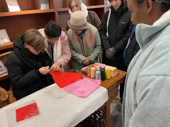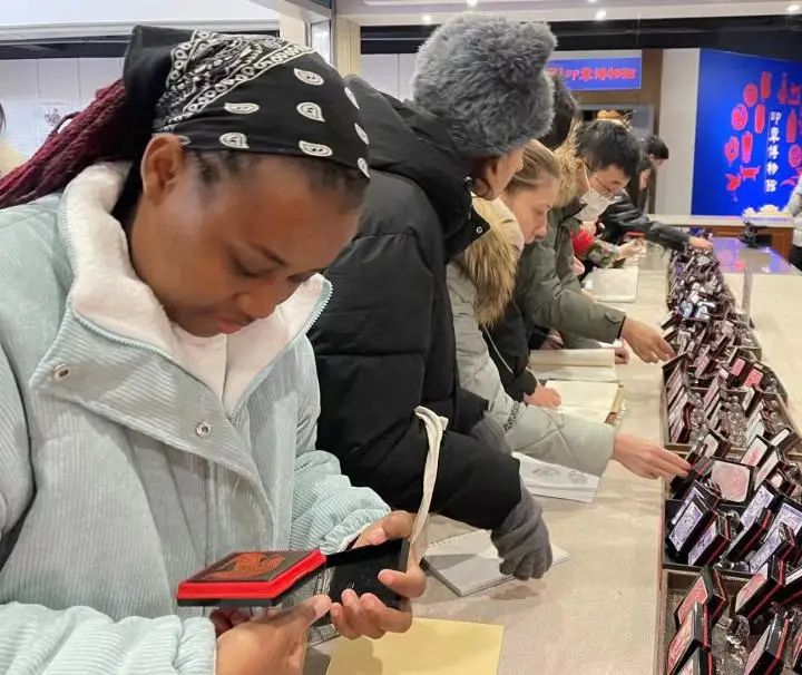 在鞍山市博物馆,现场讲解员给留学生们讲解了鞍山的远古文明、近代文明等,展示了不同历史背景中的文化内涵。在尹航满族刺绣馆,留学生们拿起针线,亲手体验和感受国家级非物质文化遗产——满绣的魅力。在鞍山印章博物馆,大家兴致盎然,争先恐后寻找自己感兴趣的馆藏文物印章以及鞍山的地标建筑,印在自己带来的笔记本上。在鞍山玉石艺术馆,留学生们亲眼见到了馆藏的岫岩玉、和田玉、缅甸翡翠等世界各地奇石瑰宝以及美轮美奂的玉雕作品;在千山田黄艺术馆,见到了荣获中国百花金奖的“松月图”,留学生们不禁啧啧称奇;在中国北方手工机绣艺术馆,大家则体验了北方机绣的独特技艺。