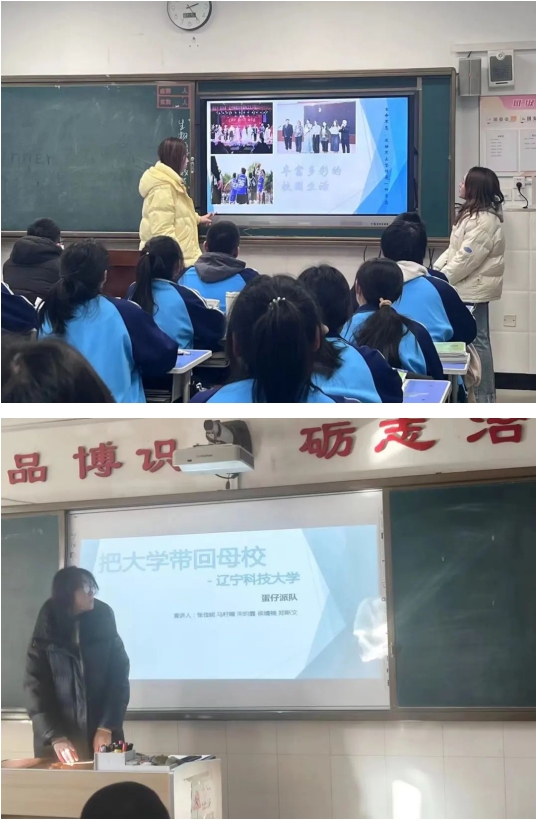 1月17日至22日,由侯婧楠、宋昀霏、张佳妮、马籽暄、郑斯文五位同学组成的“蛋仔派队”在鞍山市第五中学、沈阳市共青团实验中学、鞍山市育英中学等学校开展了“把我的大学带回母校”社会实践活动。他们向学弟学妹们讲述自己在8xbet手机客户端的故事,让他们更加深入了解了真正的大学生,大学生活是什么样,使他们对大学有了更多的憧憬与遐想。在8xbet手机客户端,她们不仅收获了丰富的知识和技能,更收获了交心的朋友和难忘的回忆。这次的活动让她们有机会把这些宝贵的财富带回母校,与学弟学妹们分享。并通过发放调查问卷的形式收集学弟学妹们的升学意向、未来规划以及对大学生活的期待。作为新一代大学生,肩负着时代责任,更应牢记初心,不忘使命,让青春在全面建设社会主义现代化国家的火热实践中绽放绚丽之花。