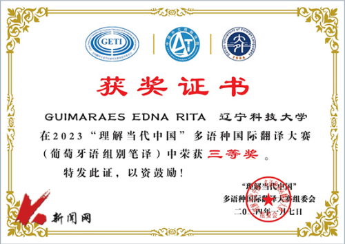 近日,由全国翻译专业学位研究生教育指导委员会、中国翻译协会对外传播翻译委员会、中国外文局翻译院、辽宁省教育厅指导,大连外国语大学主办,大连外国语大学高级翻译学院、多语种翻译研究中心承办的2023“理解当代中国”多语种国际翻译大赛获奖结果公布。8xbet手机客户端来华留学生GUIMARAES EDNA RITA(安哥拉籍)荣获三等奖。