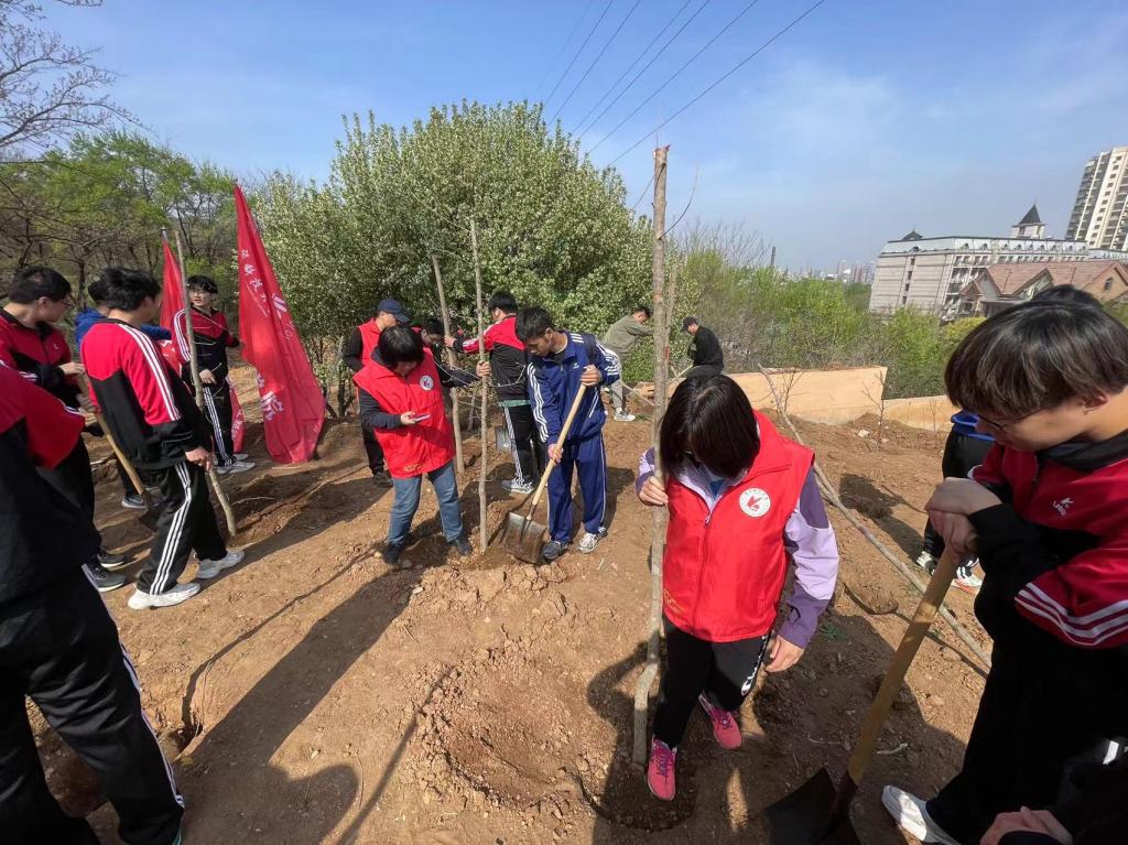 活动现场,在鞍山市自然局专业人士指导下,师生党员、青年学生情绪高涨,两人一组、配合默契,挥锹铲土、扶正树苗、填平树坑、踩实新土、提水浇灌等一气呵成,一棵棵新栽种的小树苗“整齐列队”,在明媚的春光中展现勃勃生机。学院党委在第55个世界地球日来临之际,组织师生参加“播种绿色希望,展现青春风采”的植树活动,栽培树苗、播撒希望、展现风采,让大家认真领悟“绿水青山就是金山银山”的内涵和实质,热爱自然、拥抱自然、保护自然,建设美丽中国,以实际行动传承并践行生态文明理念,共同构建人与自然和谐共生的地球家园。